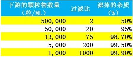 目前来说,表现过滤精度和过滤效果常见的指标是Beta值(β值),β值是过滤比,它是滤芯上游和滤芯下游油液中含有的一定尺寸颗粒物数量比值。 在检测滤芯的过滤效果时,先使用颗粒物测量仪检测滤芯上游油液中,单位体积内的一定尺寸杂质颗粒数量、大小,然后测量滤芯下游单位体积油液内的颗粒物数量、体积,然后把上游的数量除以下游的数量,得到的比值就是过滤比,例如:检测滤芯上游,尺寸大于5微米的颗粒物数量为10个。经过滤芯过滤后,下游测得的5微米以上的颗粒物数量为1个,那么相对于5微米这个精度级别,滤芯的过滤比就是10/1=10,标示为β5 =10。显然,β值越大,说明过滤效果越好。选购滤芯时,除了看过滤精度,还要看过滤比。以5微米颗粒为例,如果上游测量到的颗粒物为100万个/ML,那么对应的下游数量和过滤比如下表: